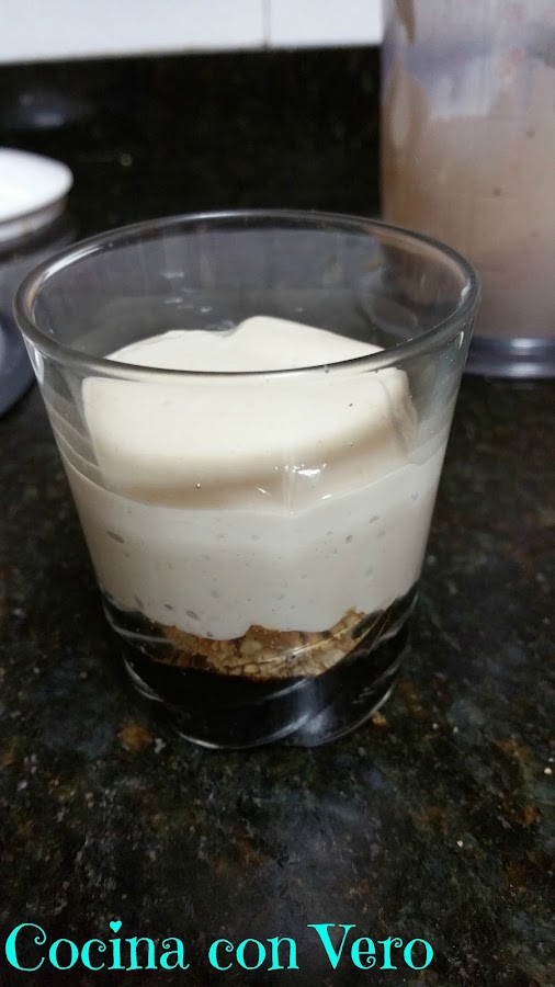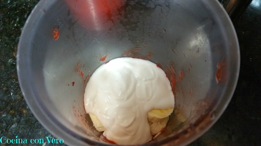 4/ Troceamos el plátano en otro vaso batidor o bien en el mismo previamente lavado, añadimos en él el yogur y batimos totalmente con la batidora. Una vez realizado ésto ya podemos montar el postre.