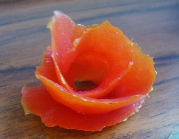 Sólo hay que recortar con un cuchillo con buen filo o un buen pelador de verduras una pequeña área en forma de remolino del tomate, de preferencia el Tomate Saladet que es más ovalado, así las flores quedarán más pequeñas, más o menos tiene que tener de ancho un centímetro, o poco menos, y en forma de espiral, yo lo corto del lado en el que no tiene el cabito el jitomate y le retiro la piel lo más delgada que pueda, en lo personal se me hace más sencillo con un cuchillo con buen filo, no tiene que ser muy largo el espiral, así es que si se te rompe no hay problema, pero si quieres darle un poquito más de vueltas a la flor y que quede un poco más tupida, entonces procura hacer unas 2 ó 3 vueltas en forma de espiral, es decir, utilizar casi toda la cáscara del tomate, y simplemente lo acomodas en la palma de tu mano y lo comienzas a girar del centro hacia afuera, de la parte más pequeña a la más grande formando la flor, tal y como se muestra en la primer fotografía... y simplemente la acomodas en el platillo y verás que este simple detalle se ve hermoso y realzará el plato, haciéndolo lucir más apetitoso y demostrarles a quienes se los compartes el cariño con el que realizaste el platillo.