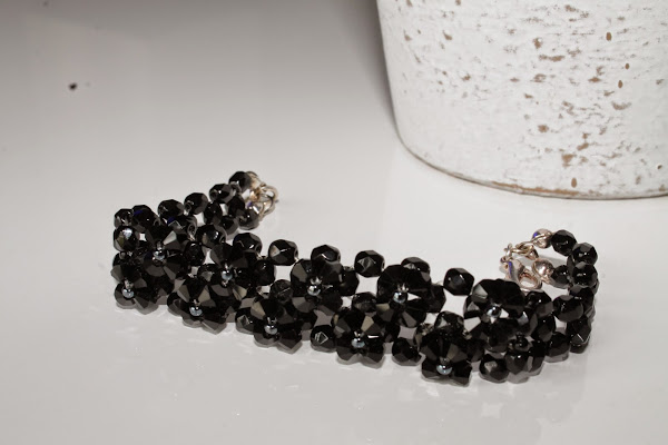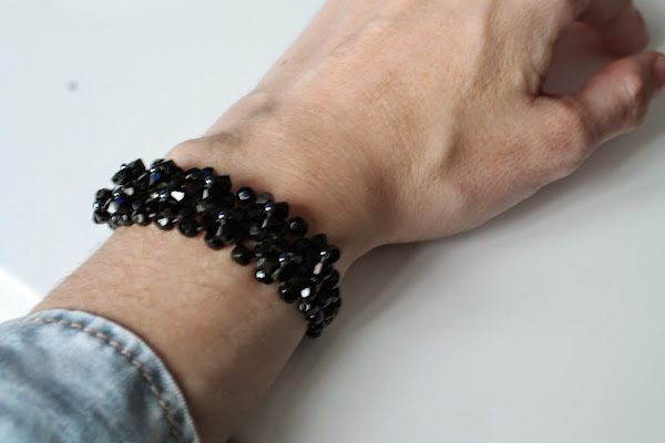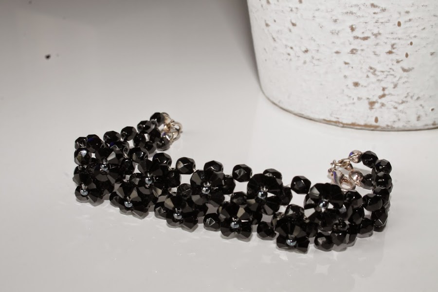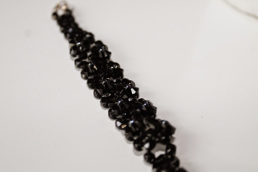 Os la voy a describir todo lo mejor que pueda. Está hecha con Swarovski toda ella, y la técnica es la básica, la de las flores de 4 bolitas. La idea es que quede una especie de esclava, sin llegar a ser brazalete, así que para ello, primero he tejido una parte de bolas facetadas de cristal negras, que son la base y "correas" de la pulsera. Y después, la parte que queda delante, lleva flores de cristal, en zigzag, de manera que están en "relieve" sobre tu muñeca.