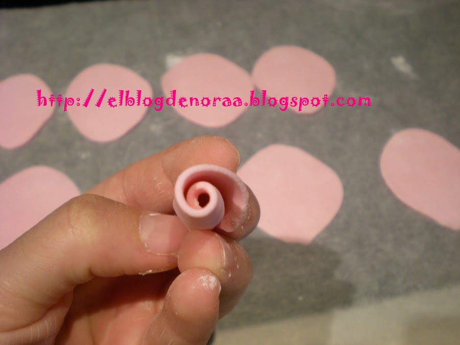 Ya tenemos los nueve pétalos. Cojemos uno y lo enrollamos quedando así: