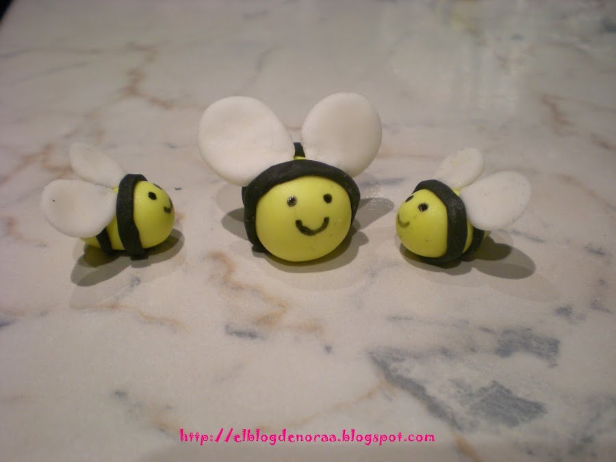 La tira negra la colocamos en dos partes sobre el cono amarillo y las dos bolas blancas las aplastamos un poco con las yemas de los dedos, le damos un pelin de forma y las pegamos cómo las alitas y después con un rotulador negro comestible les pintamos los ojos y la boca y mira que familia de abejas más bonita!!!