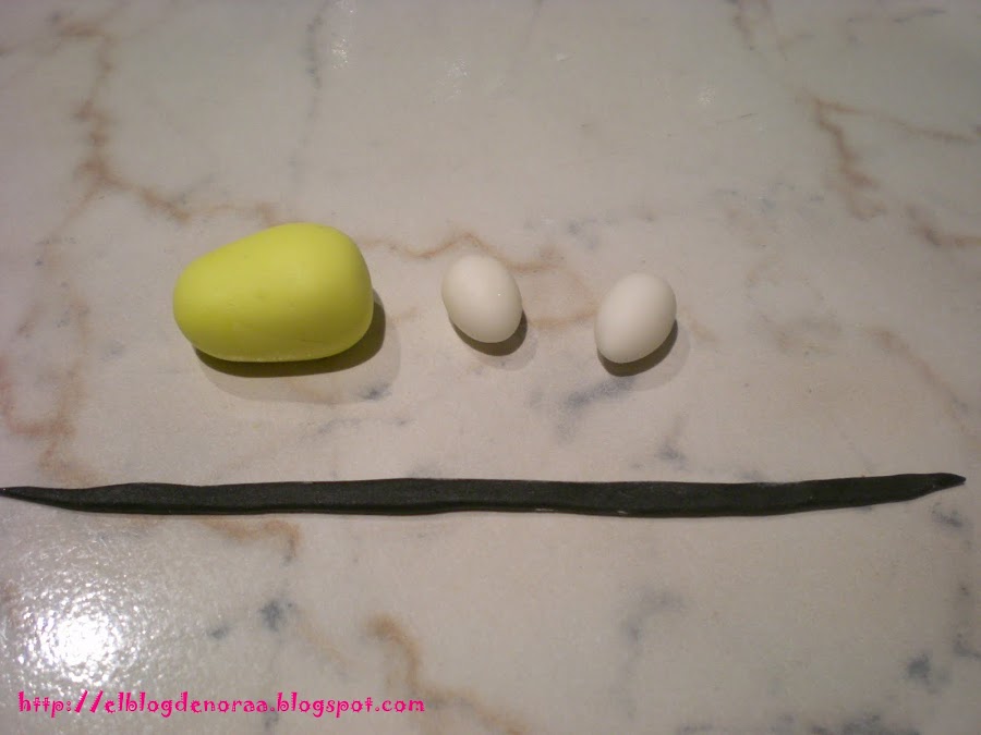 Con una bola amarilla le damos un poco de forma de cono, cómo la fresa. Hacemos otras dos bolitas más pequeñas blancas y hacemos una tira negra un poco aplastada, más o menos de el grosor que sale en la foto: