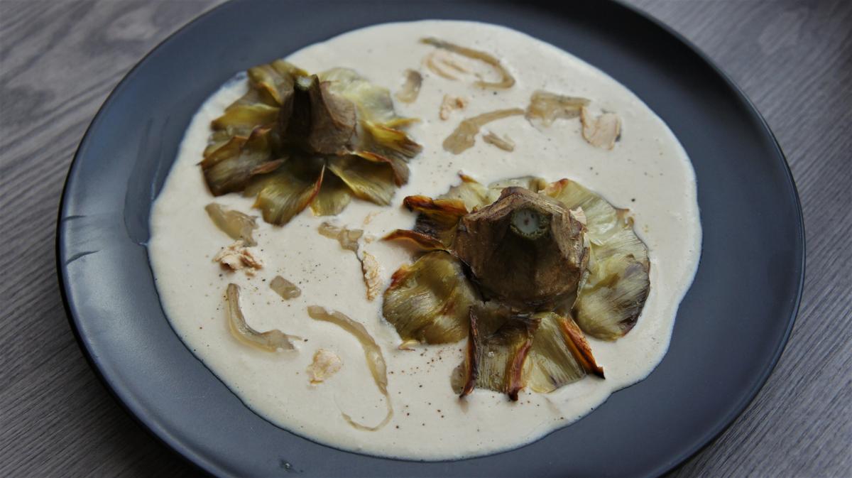Trituramos la salsa, la ponemos en el fondo del plato y colocamos encima las alcachofas. Decoramos con unas tiras de cebolla caramelizada y virutas de foie.