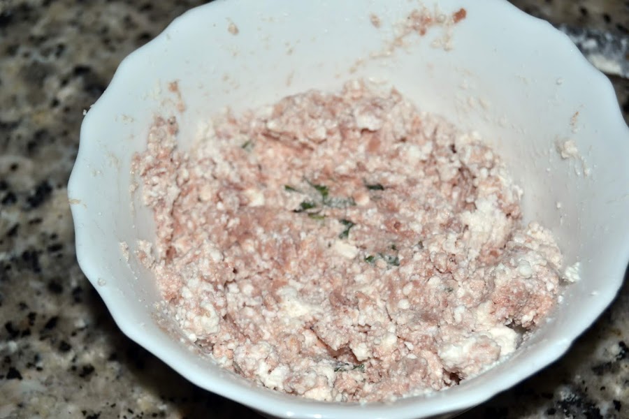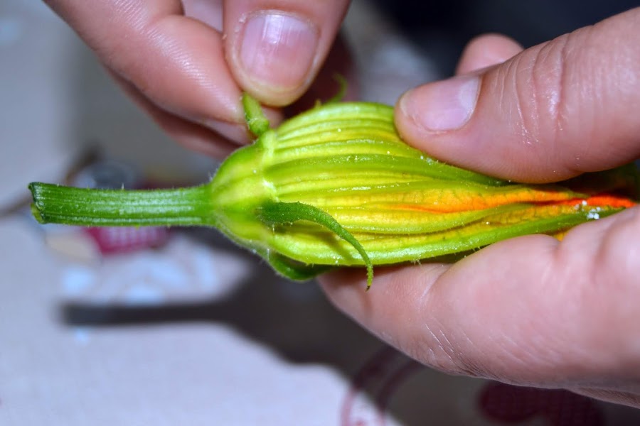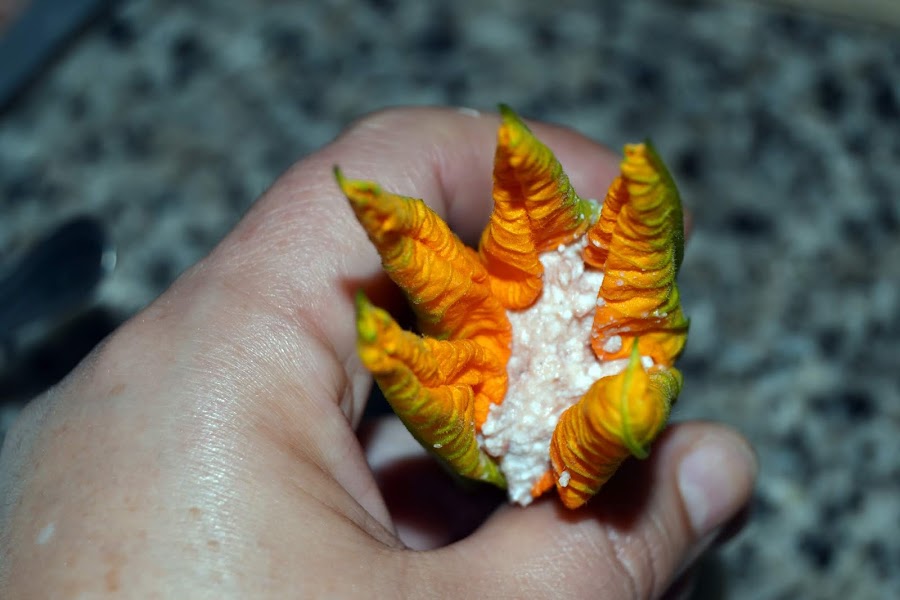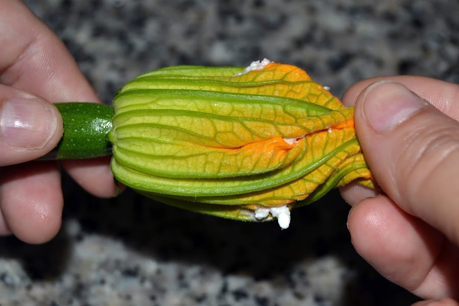 Ahora vamos rellenando las flores de calabacin, con mucho cuidado.