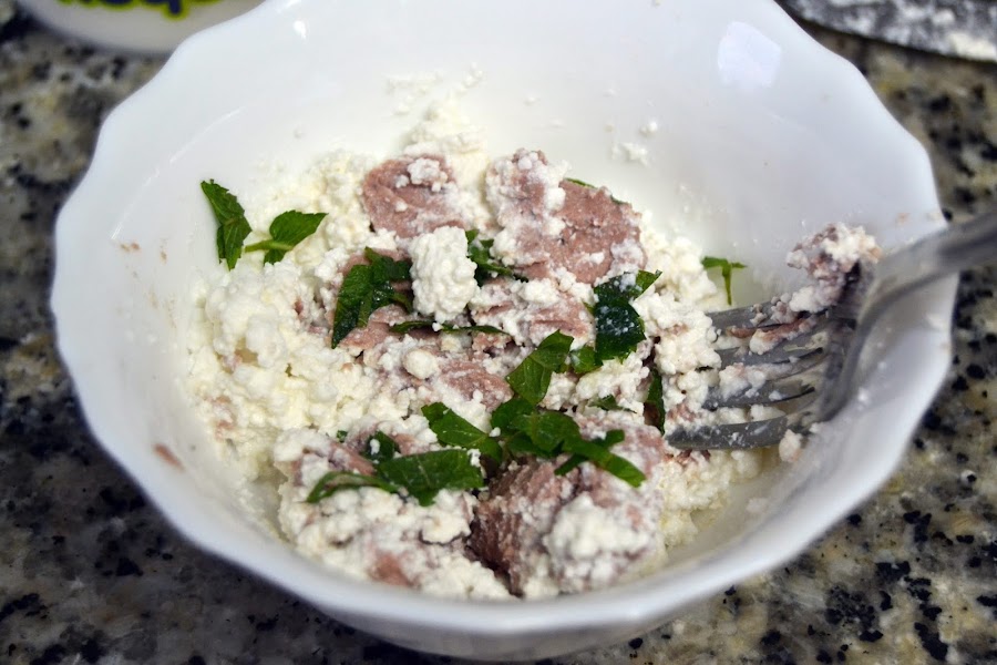 En un bol ponemos el paté y el requesón y cortamos las hojas de hierbabuena, que antes habremos lavado en trocitos pequeños.