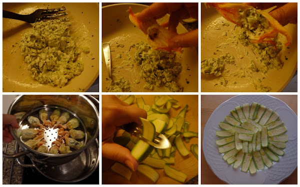 Flores de calabacín rellenas y carpaccio de calabacín, preparación: