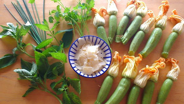 Flores de calabacín rellenas y carpaccio de calabacín, ingredientes:
