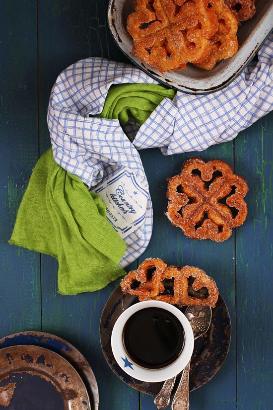 Y empezamos el proceso de fritura que es lo más delicado. En una olla o cazo hondo ponemos abundante aceite a calentar. Metemos el molde de las flores en el aceite y dejamos que caliente un par de minutos. Lo sacamos e inmediatamente lo metemos en el bol de la masa sin llegar hasta el borde (lo mojamos 3/4 o sino no se despegarán). Rápidamente metemos el molde en el aceite caliente bien caliente. Por si solas se soltaran del molde, les damos la vuelta con una espumadera y sacamos a un plato con papel absorbente. Repetimos el proceso hasta que terminemos la masa.