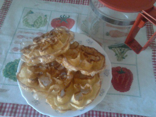 Un día rebuscando en los cajones de la cocina, encontré un molde muy raro, era de hierro, con una forma que parecían cuatro corazones. Le pregunté a mi madre y me dijo que era para hacer flores. Flores? Qué es eso? Entonces se puso a hacerlas, se sabía la receta de memoria. Y cuando las hizo, quedé impresionada, qué fácil!! Qué ricas!!
