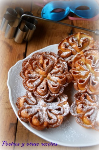 No he podido resistirme a hacer unas flores antes de que termine el carnaval. Hace tiempo que tengo el molde, lo podéis encontrar en ferreterías, grandes almacenes y tiendas de menaje. Veréis que su elaboración es muy fácil y que en nada os aparecerá una fuente llena de deliciosas flores. Personalmente me encantan con azúcar glas por encima, pero hay quien prefiere miel o chocolate. De cualquier manera están buenísimas.