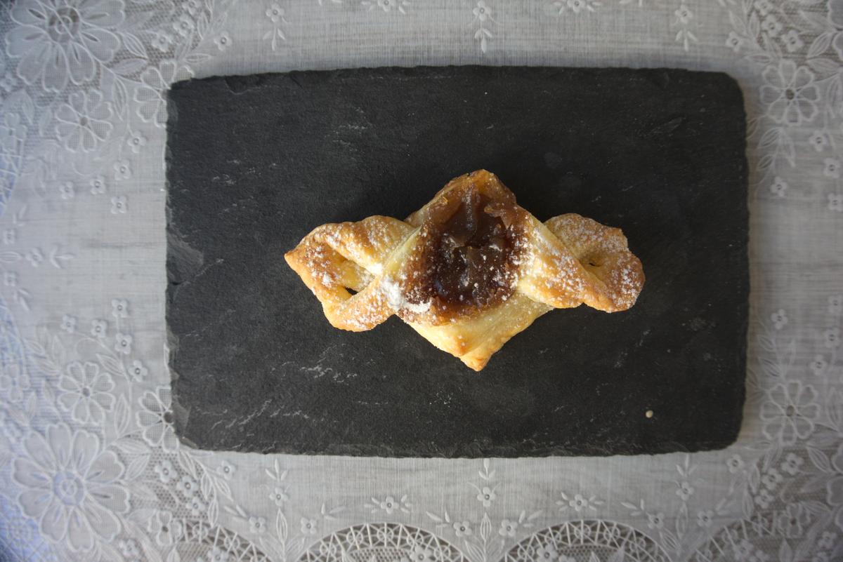 Cogemos un cuadrado y lo doblamos en 2 formando un triángulo. Dejando un borde de 1 cm por cada lado cortamos a lo largo de cada arista hacia la punta central sin que llegue a tocarse. Despegamos el triángulo y volvemos a formar el cuadrado. Tomamos la solapa superior y la llevamos hasta el borde interior inferior. Hacemos lo mismo con la otra solapa en sentido inverso. Rellenamos con una cucharada de crema de castañas.