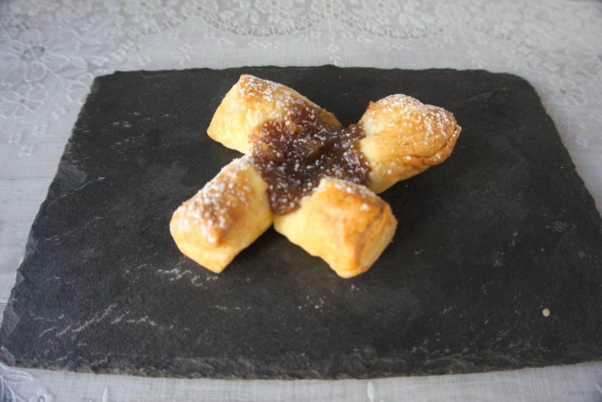 Cogemos un cuadrado y dejando un borde de 1 cm hacemos unos cortes laterales partiendo de cada esquina a lo lardo de las 4 aristas dejando un espacio en medio de cada lado sin cortarse. Cogemos la esquina interior que hemos cortado y la llevamos al centro del cuadrado. Hacemos lo mismo con las 3 esquinas restantes. Ponemos encima una cucharada de crema de castañas.