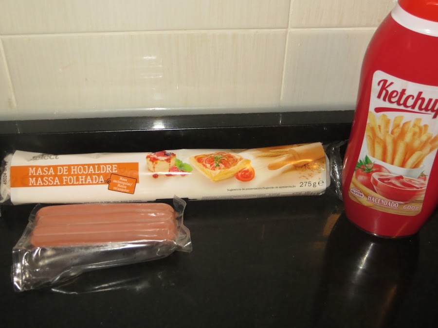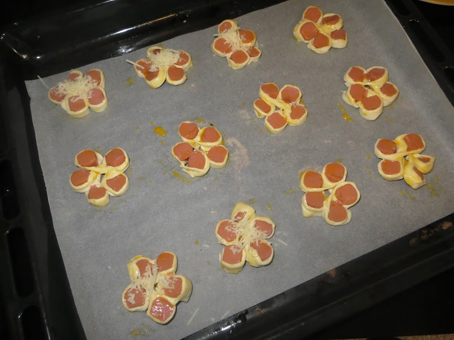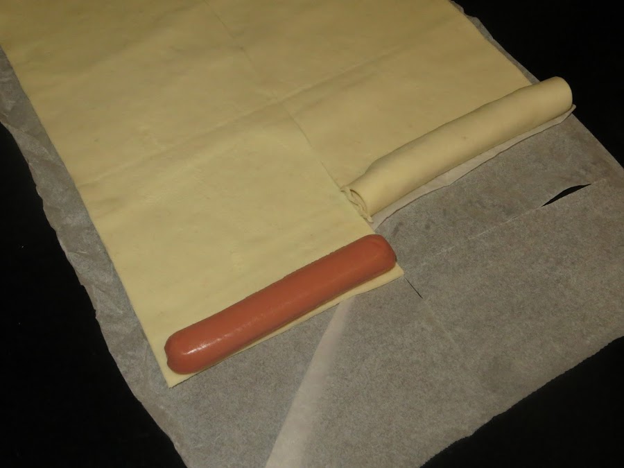 Enrollamos cada una de las salchichas en masa de hojaldre, las partimos por la mitad y a su vez hacemos cuatro cortes, cortando la salchicha, pero no cortando el hojaldre para luego darle forma de flor.
