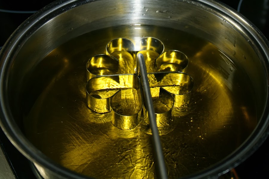 Yo usé una pota pequeña para que el aceite suba en altura y cubra bien el molde.