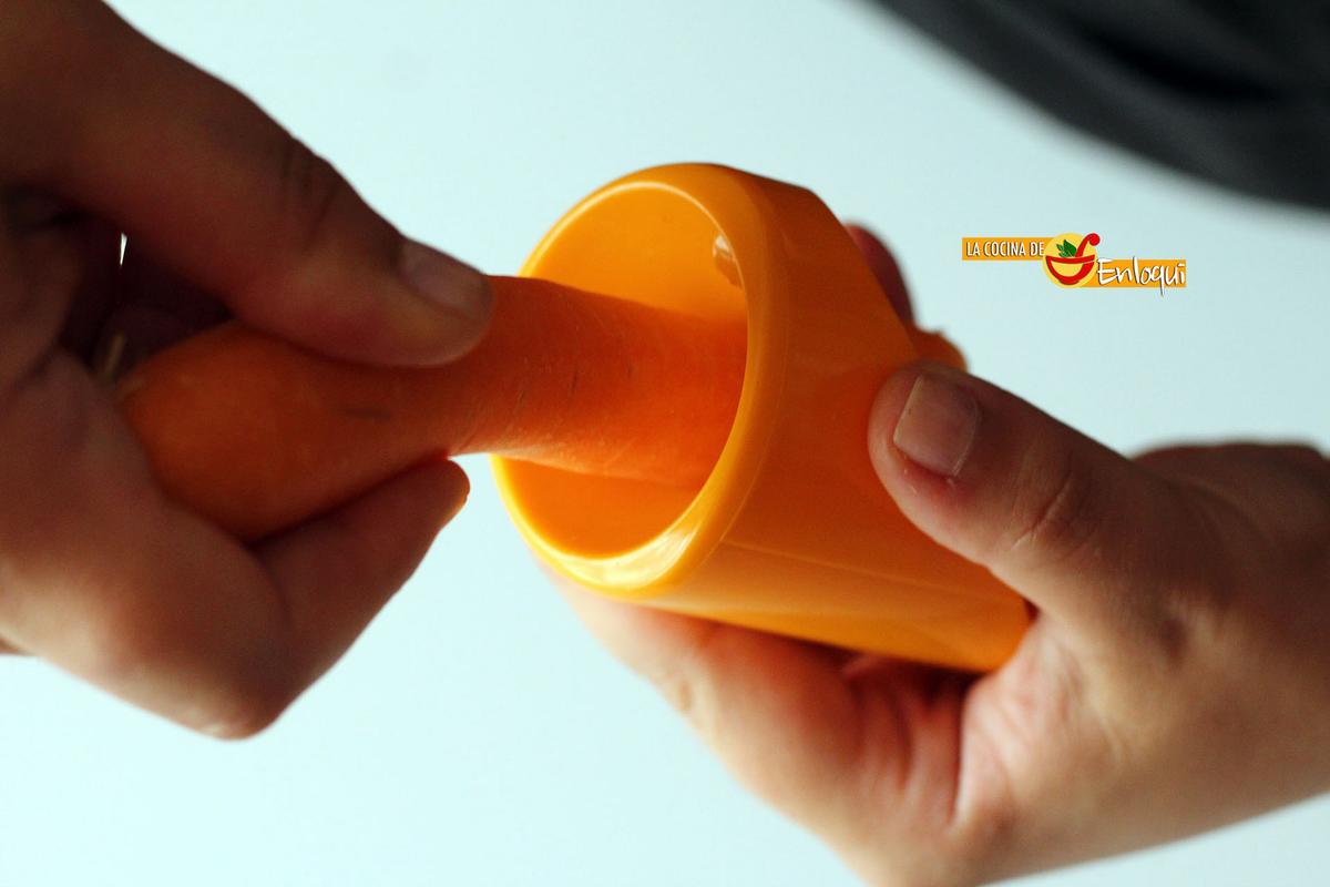 La forma de proceder es de lo más sencilla, sólo debes introducir la zanahoria bien lavada y seca en el sacapuntas en cuestión. Como si de un lápiz se tratara, gira tantas veces como desees, en función del tamaño que quieras para tu flor.