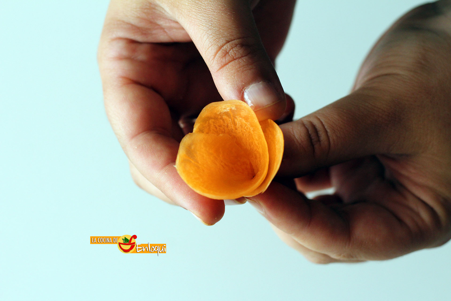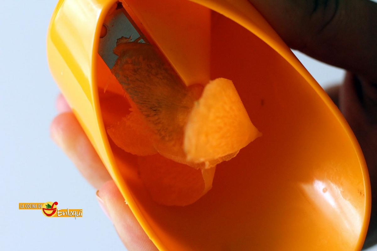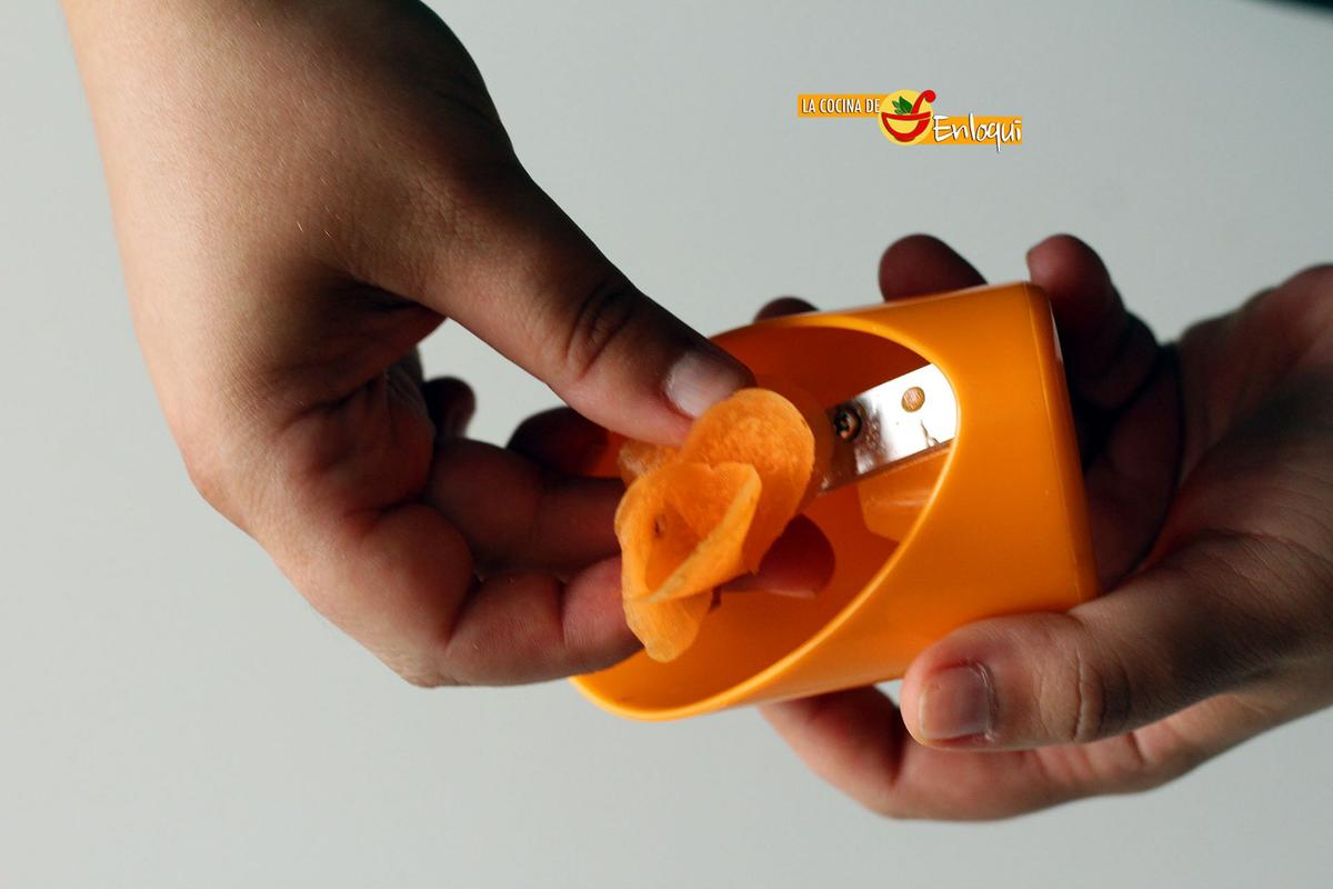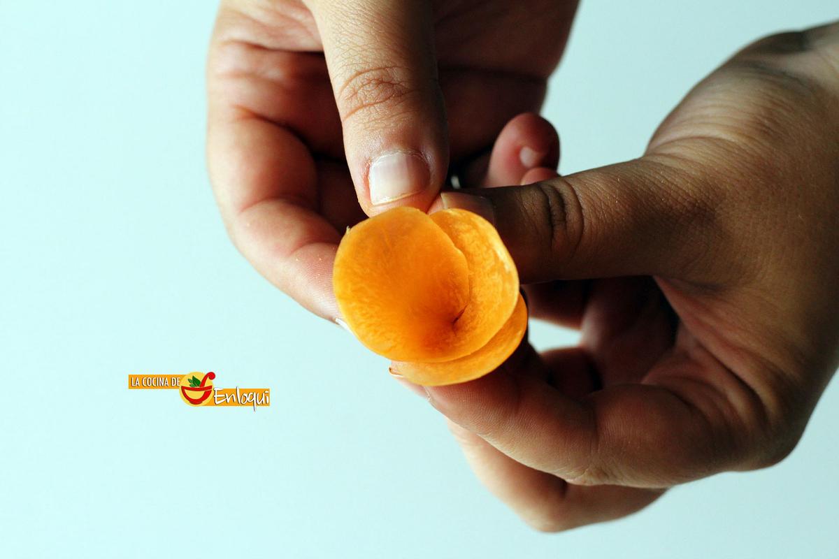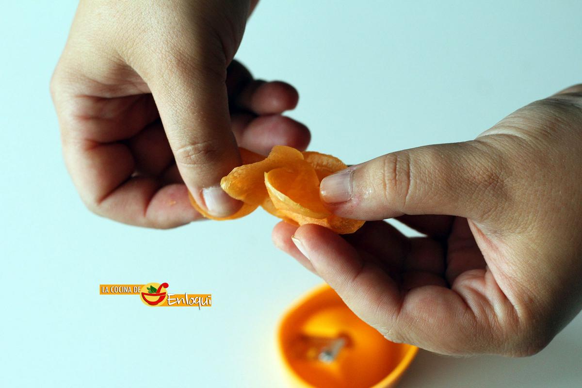 Verás cómo por la parte posterior comienza a salir una delgada lámina de zanahoria con la que daremos forma a la flor.