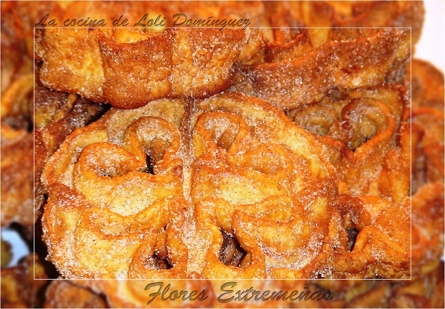 Preparación: En un bol adecuado se pone casi toda la harina (¾ partes para ajustar a posteriori ). Se añade la ralladura de un limón y se le agregan los huevos, (Uno de estos huevos se parte la parte superior de la cáscara y es la que nos servirá de medida). Se le añade 3 medidas de leche y una de aceite; Se bate bien y si es necesario le añadiremos harina (debe de quedar semilíquido). Calentamos el recipiente del aceite con el molde de las flores dentro y cuando estén bien calientes sumergimos el molde en la masa sin llegar a la parte superior aproximadamente ¾ partes y levantamos que escurra brevemente, sumergimos en el aceite, agitamos que se suelte la flor del molde y freímos. (El molde lo dejamos dentro del aceite mientras tanto) Cuando esté dorada la flor pasamos a un papel absorbente; Mezclamos el azúcar y la canela y con esta mezcla emborrizaremos las flores y listo para comer. ¡¡Probadlas os van a encantar!!