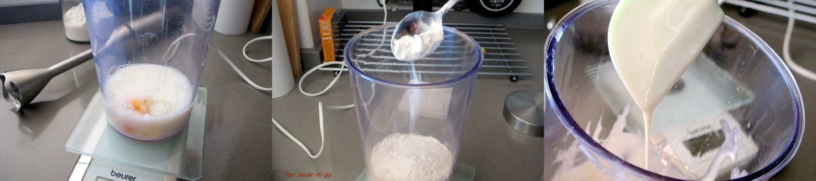 En el vaso de la batidora colocar el huevo, la leche y la harina, añadir el aceite frito y el orujo de hierbas. Batir hasta integrar los ingredientes y conseguir una masa fina.
