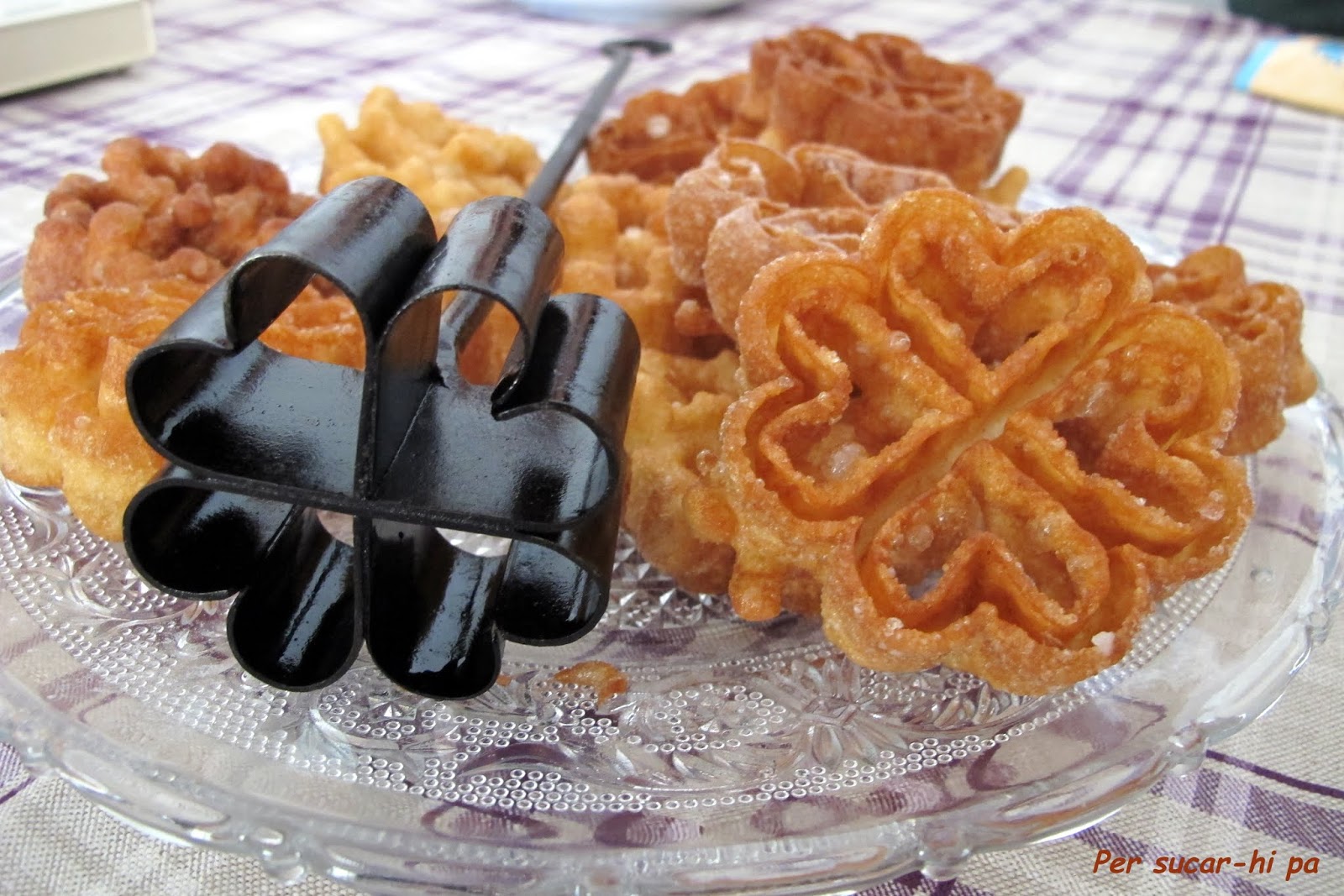 Para la ocasión he elegido estas Flores manchegas, dulce típico de ya sabéis donde. Al parecer tienen su origen en Campo de Calatrava (Ciudad Real) y son propias de Carnaval y Semana Santa. Yo las conocí y las probé de la mano de mi amiga Luisa, así que he recurrido a ella y me ha prestado para la ocasión su molde familiar. Natural de Manzanares, tiene más de 100 años (el molde, Luisa no!) y como veis es elemento imprescindible para dar esa forma tan bonita y regular a las flores.