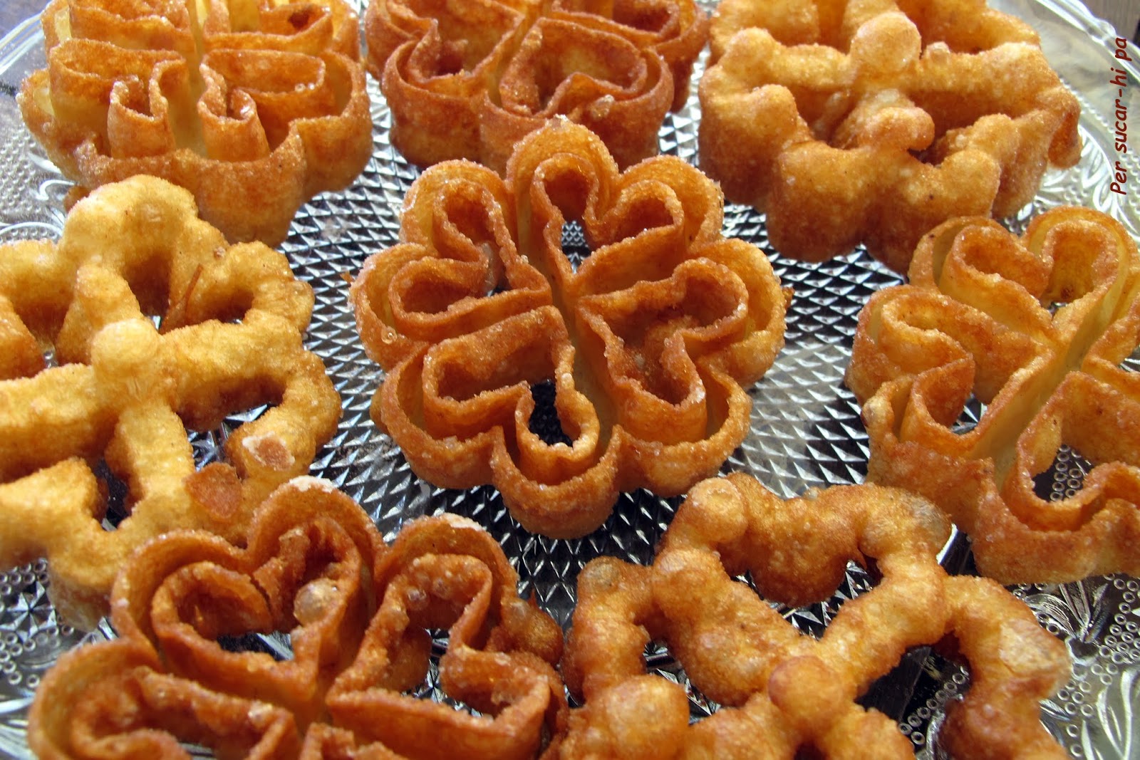 Para acabar de formular la receta, también he curioseado los blogs de dos manchegas de referencia, Chus Dae y Julia Romero, y entre unas y otras y la inspiración del última hora, han salido estas "flores fusión", con una aromática mezcla de especias. Las hemos compartido como postre en una comida familiar, algunas regadas con buen chocolate negro deshecho, y han tenido buenas críticas.