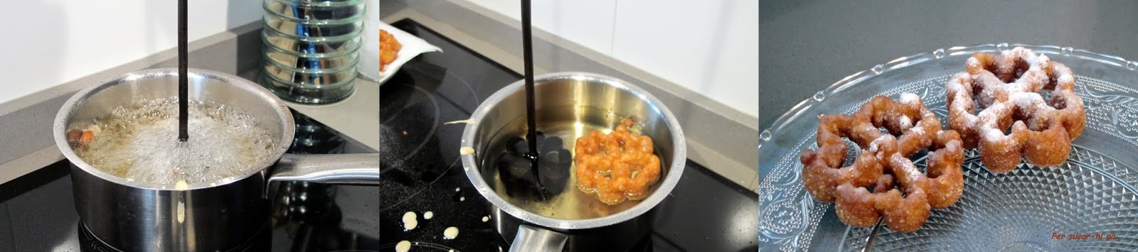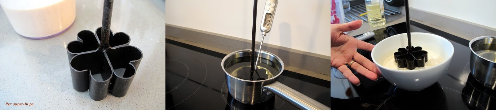 Colocar un cazo o sartén al fuego con abundante aceite y calentar. Sumergir el molde en el aceite y dejar que se caliente. El aceite debe alcanzar una temperatura entre 180 y 200º.