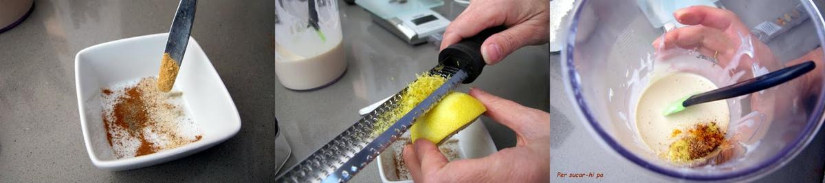 En un bol o plato mezclar las especias, muy poca cantidad de cada una. Añadir la ralladura de la piel de medio limón y la misma cantidad de piel de naranja. Mezclar con la masa hasta que se integren bien.