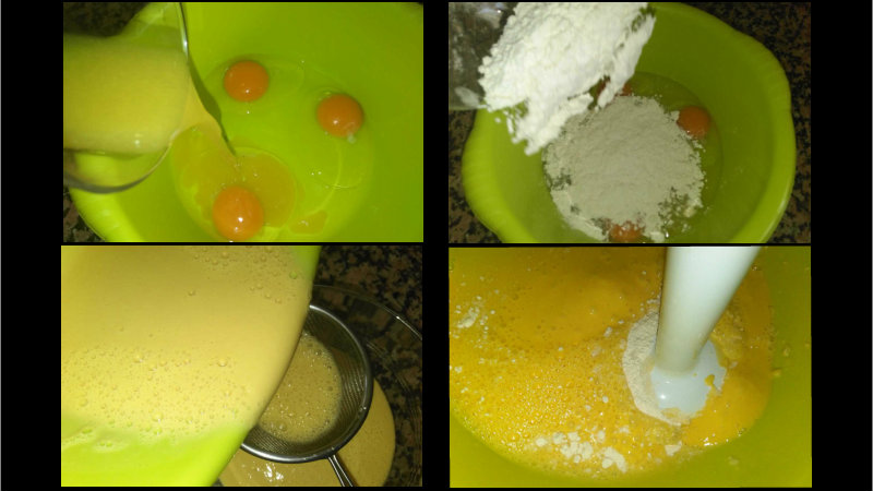 En un recipiente echamos los huevos, el zumo, el agua y la harina, luego con ayuda de la batidora batimos bien los 4 ingredientes