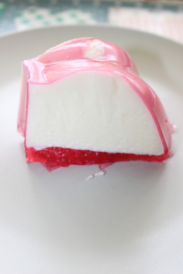 La gelatina de frambuesa la prepare siguiendo las instrucciones del fabricante.(disolver en agua caliente). La deje enfriar un buen rato.