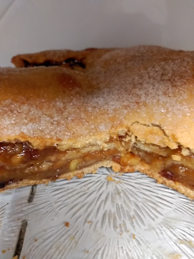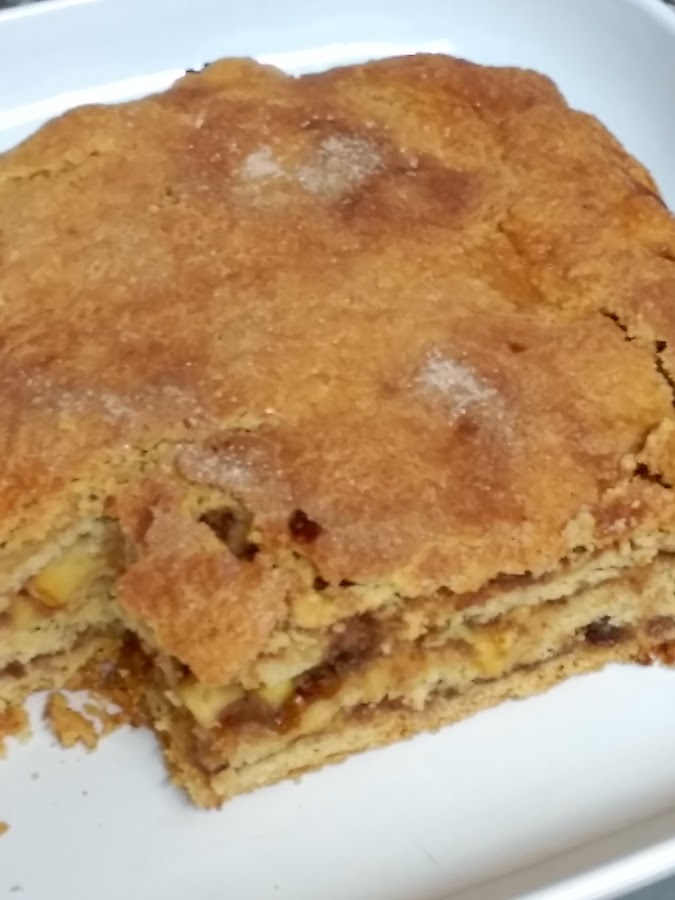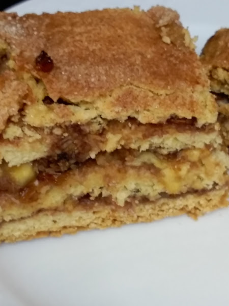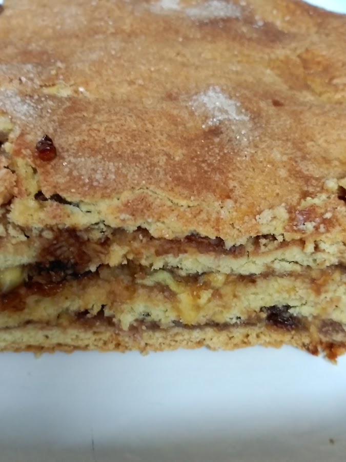 Relleno: mezclar los ingredientes del relleno y poner 1/4 del relleno sobre la masa. Cubrir con otra parte de la masa y así alternar relleno y masa hasta terminar en una capa de masa. Pintar con huevo y espolvorear con azúcar y canela y poner al horno precalentado a fuego medio por una hora.