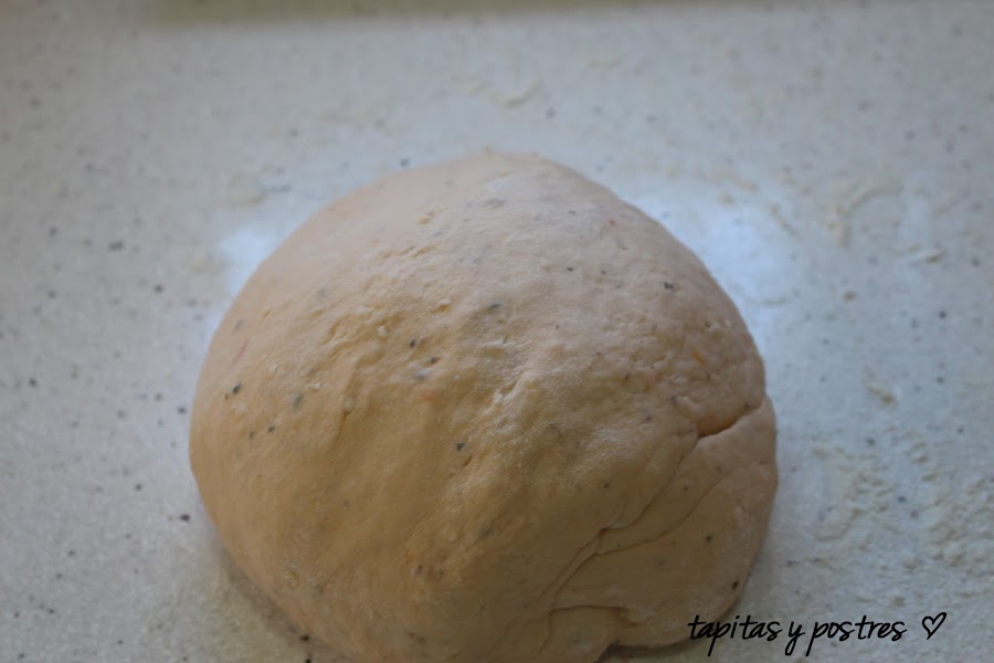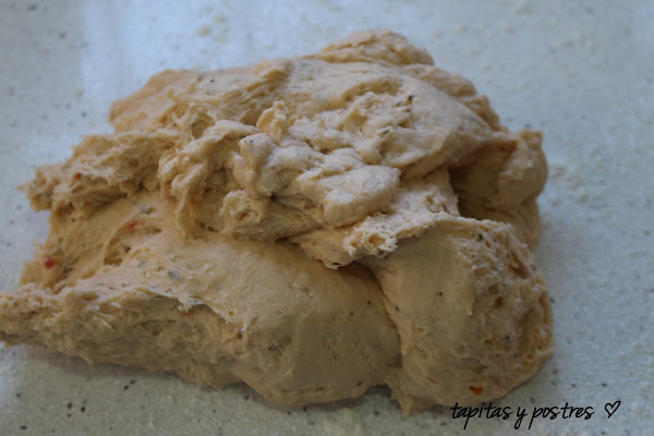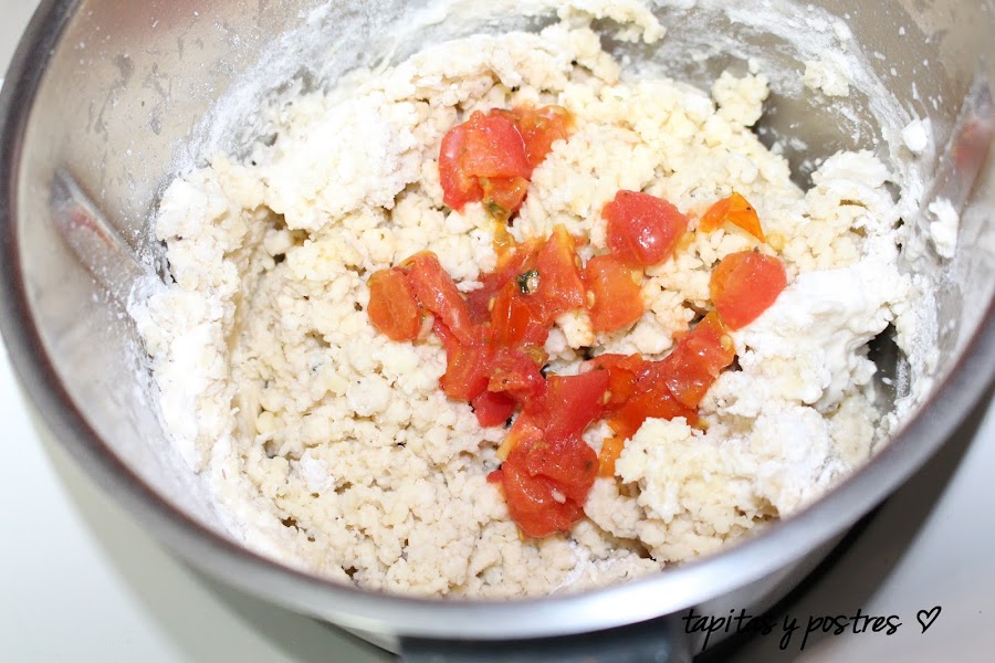 Y unos daditos de tomate hidratado y picado chiquito. Amasamos.