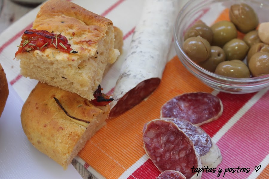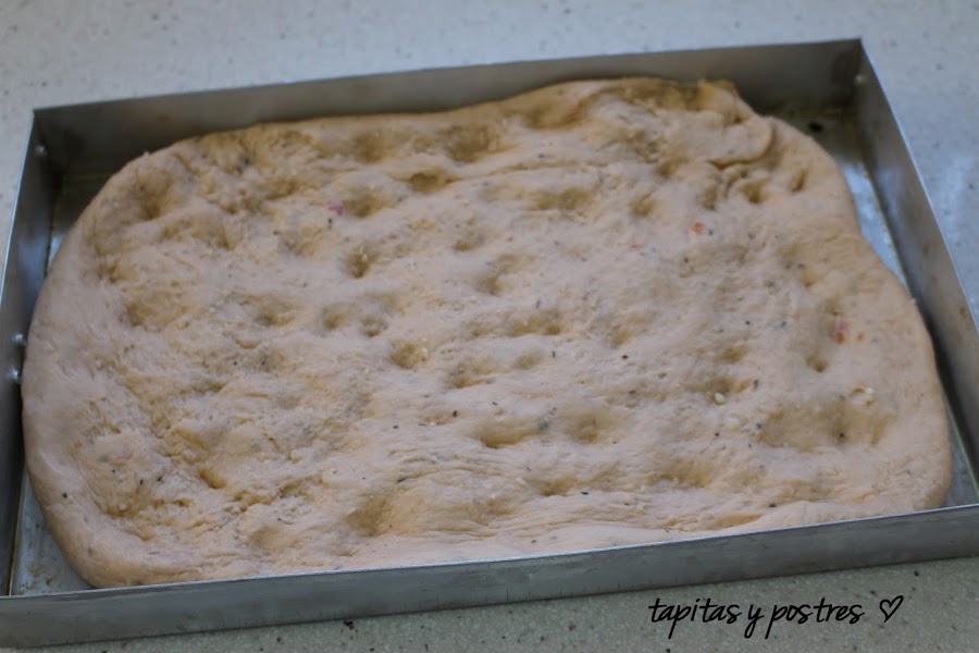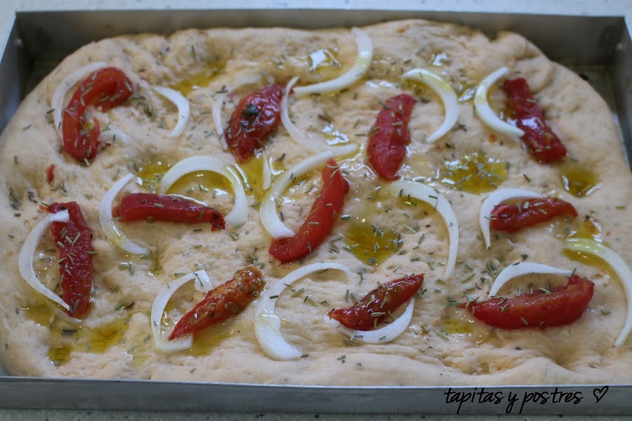Ya los he usado en otro plato, pero en esta focaccia quedan de lujo. Le da un punto muy italiano. Ya sabéis como preparar los pomodoraccio, pero si no os queréis complicar comprad tomates secos en el supermercado pero hidratarlos en aceite un poquito antes.