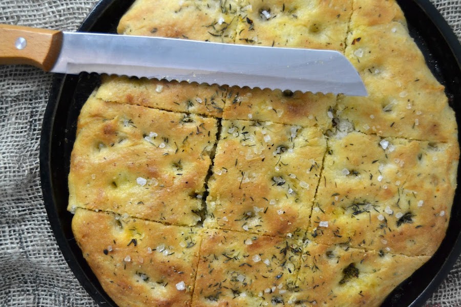 7.- Metemos la focaccia en el horno a 220 °C (precalentado) y la cocemos durante 30 minutos. La podemos comer templada, o fría. Aguantará perfectamente un par de días si la resguardamos del aire.