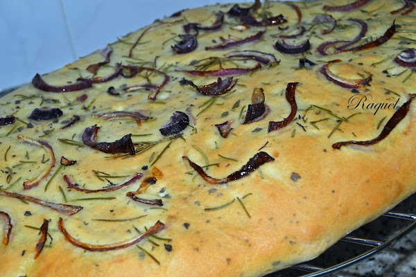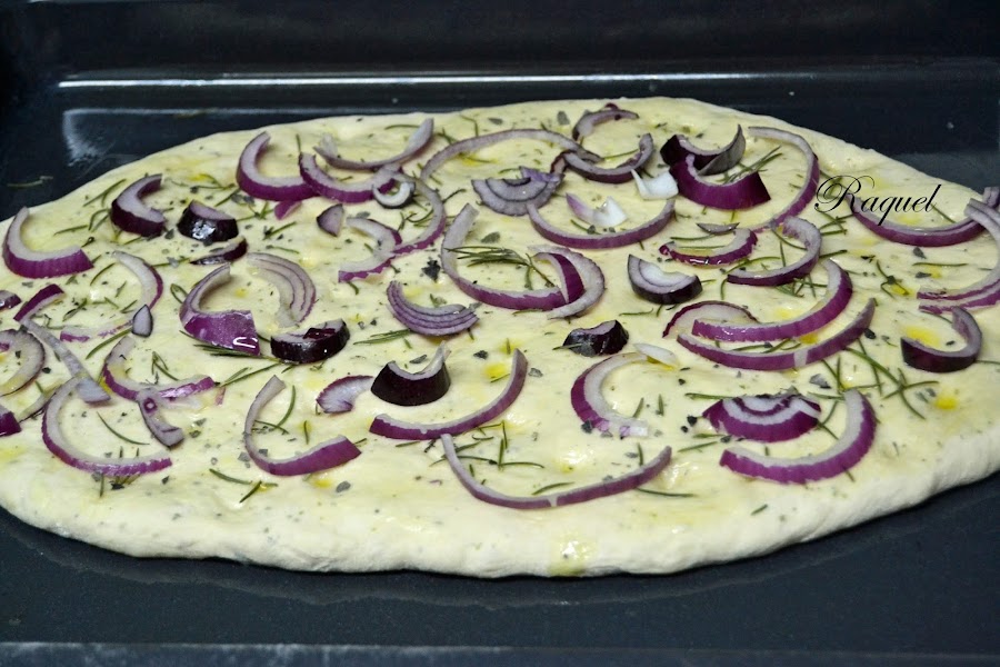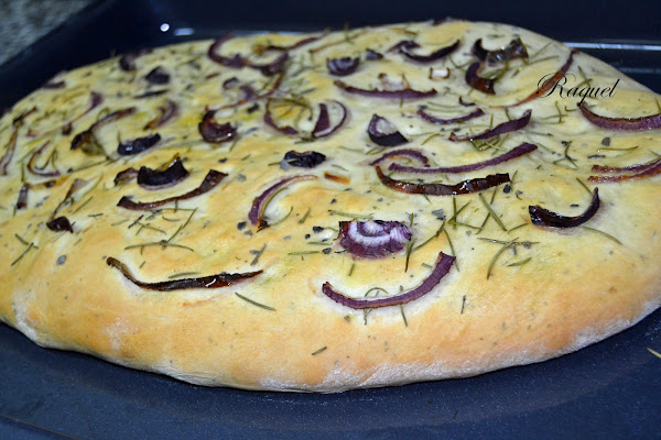 Como ya os dije el otro día que hice las berenjenas con tomate y queso gratinado al horno me apeteció acompañarlo con una Focaccia con cebolla y romero y aunque esta mal que lo diga yo. Estaba riquísima!! hasta ahora una de las mejores que he comido, no se si sera porque la hice con tantas ganas o fueron los ingredientes, claro que lo que no me cabe duda alguna es el toque final, con un buen chorreón de aceite del pueblo, de ese tan bueno que su sabor te llega a todos los sentidos.