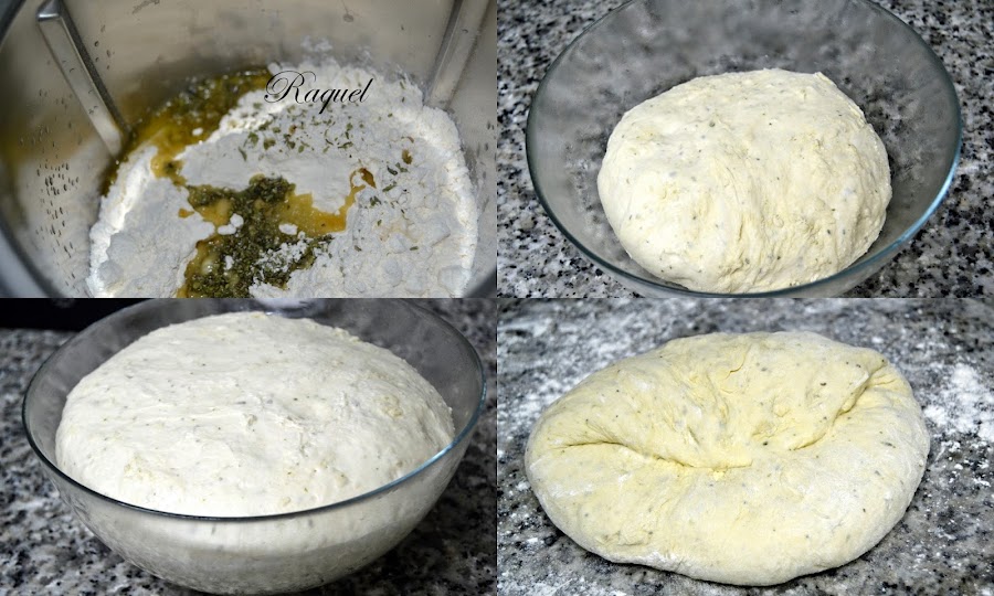 Sacamos la masa y formamos una bola y la ponemos en un bol untado con unas gotas de aceite, tapar con un paño húmedo mejor en agua muy caliente y mantener en una zona templada en mi caso calenté el horno a 40º, lo apague y metí el bol, dejar reposar 30 minutos.