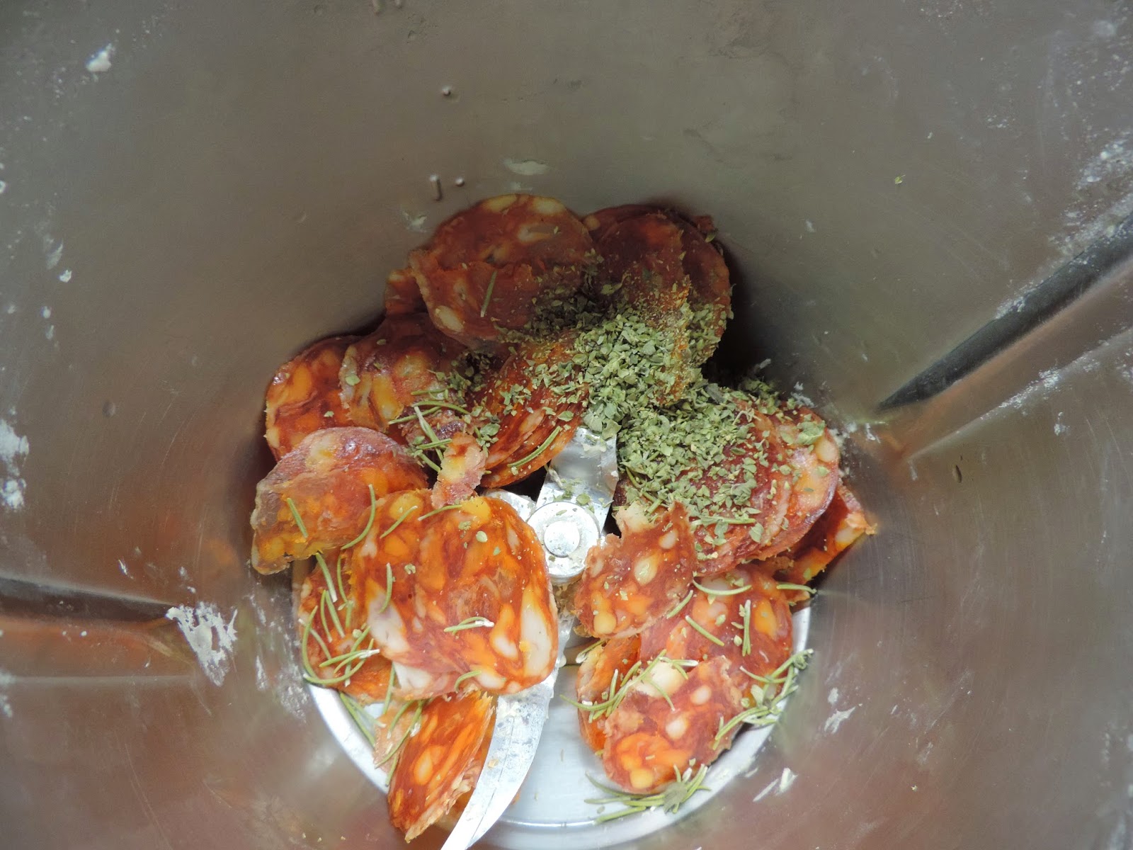 Poner el chorizo, orégano y tomillo en el vaso del thermomix.