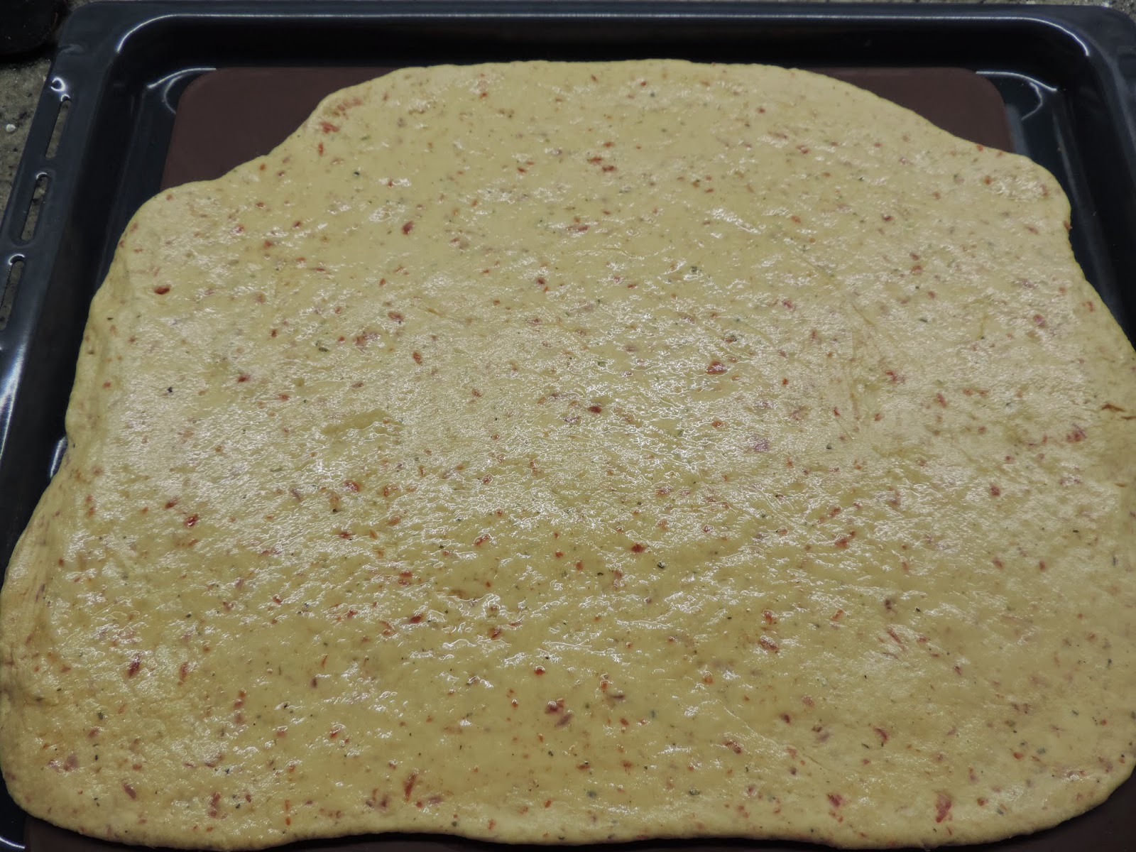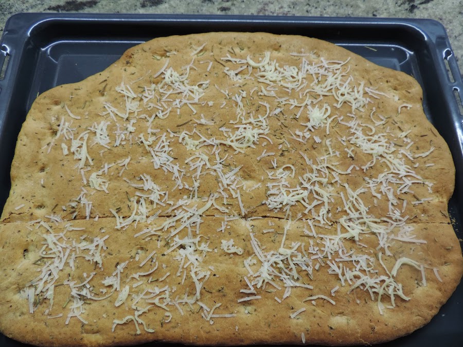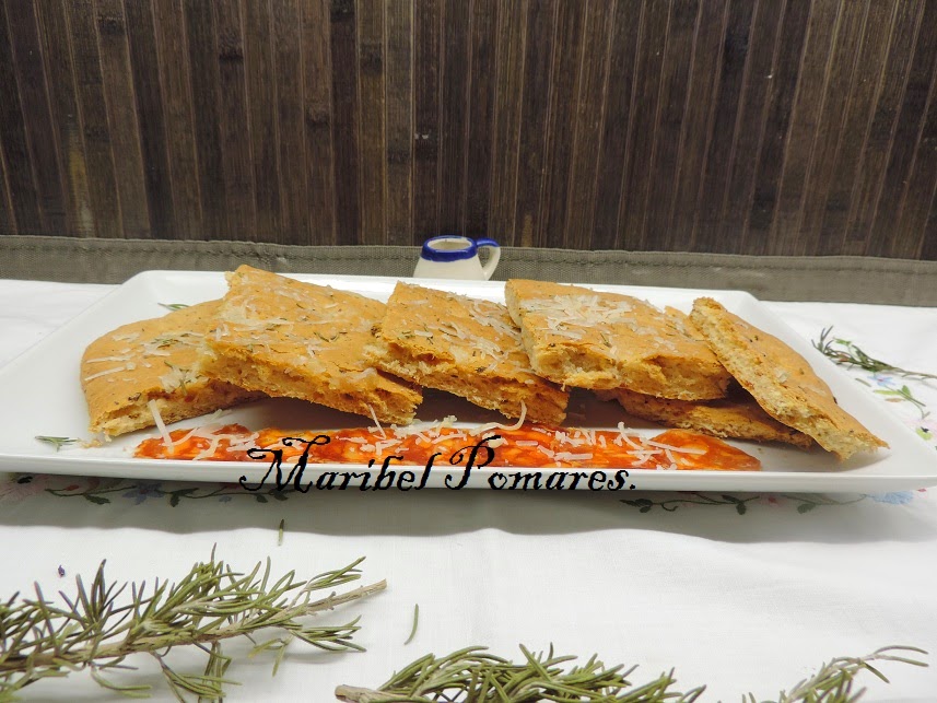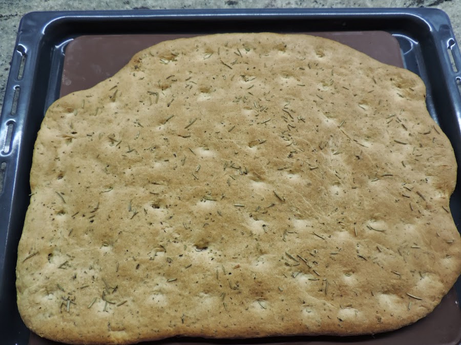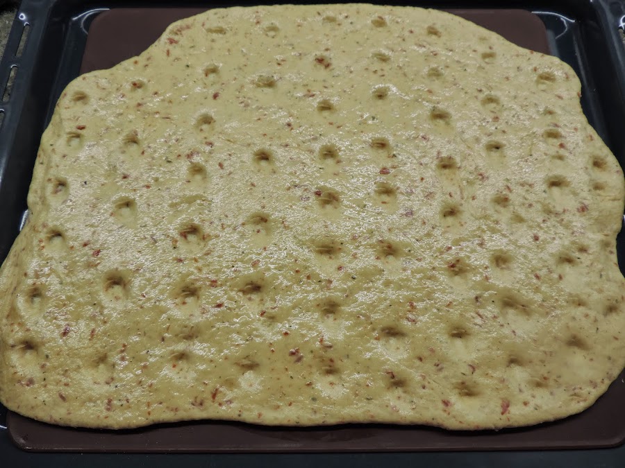 Untamos con aceite de oliva y hacemos los huecos que lleva la focaccia.