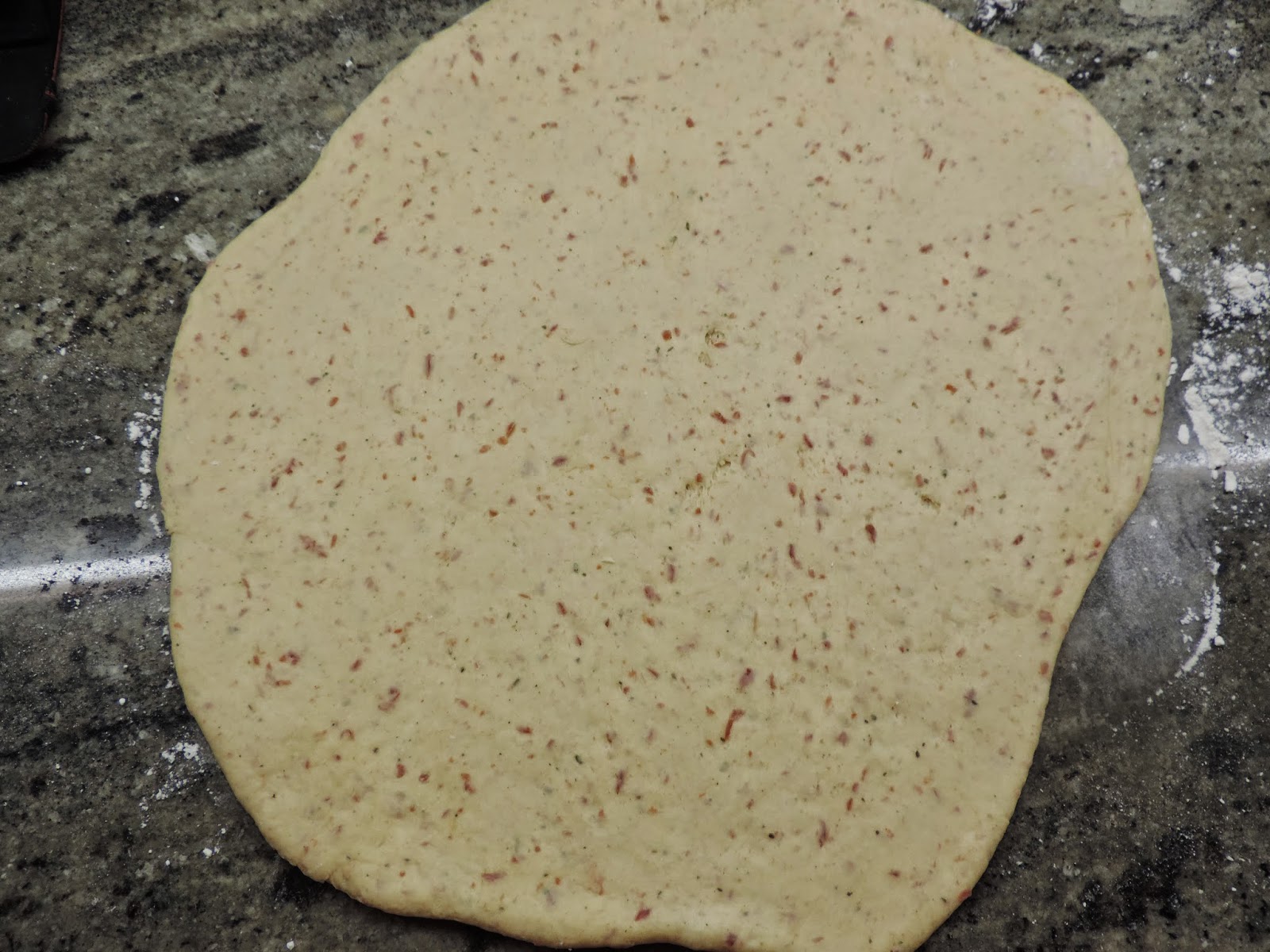 Estiramos en una superficie enharinada y formamos un rectángulo de 1 cm, de grosor.