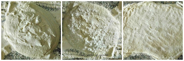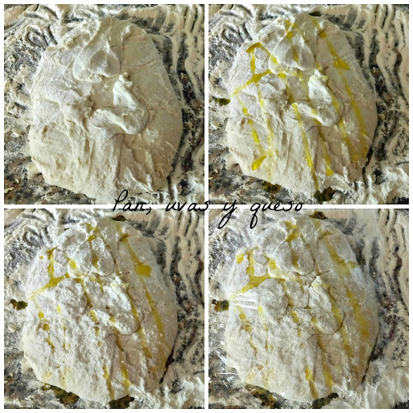 Dejamos que repose 30 minutos. Volvemos a repetir los pasos anteriores (estirar, doblar, aceite, harina y tapar). Dejamos que repose otros 30 minutos y repetimos el proceso por última vez. La última fermentación será de una hora.