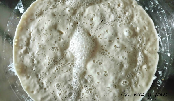 Para preparar el poolish disolvemos la levadura en un poco de agua templada. En un bol mezclamos la harina, el agua restante y la levadura. La masa será blanda y pegajosa. Tapamos el bol con film de cocina y dejamos que fermente a temperatura ambiente durante 3 ó 4 horas, o hasta que aparezcan burbujas y la masa quede muy esponjosa. Lo metemos en la nevera tapado, donde podemos conservarlo hasta 3 días.