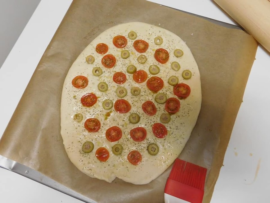 7-Cortamos en rodajas los tomates y las aceitunas y vamos colocando por encima de la masa, presionando un poco, espolvoreamos romero por encima.