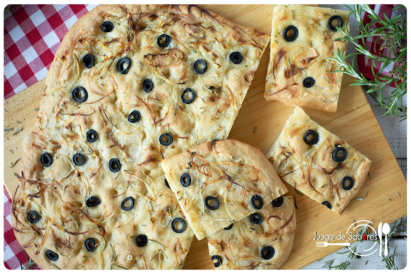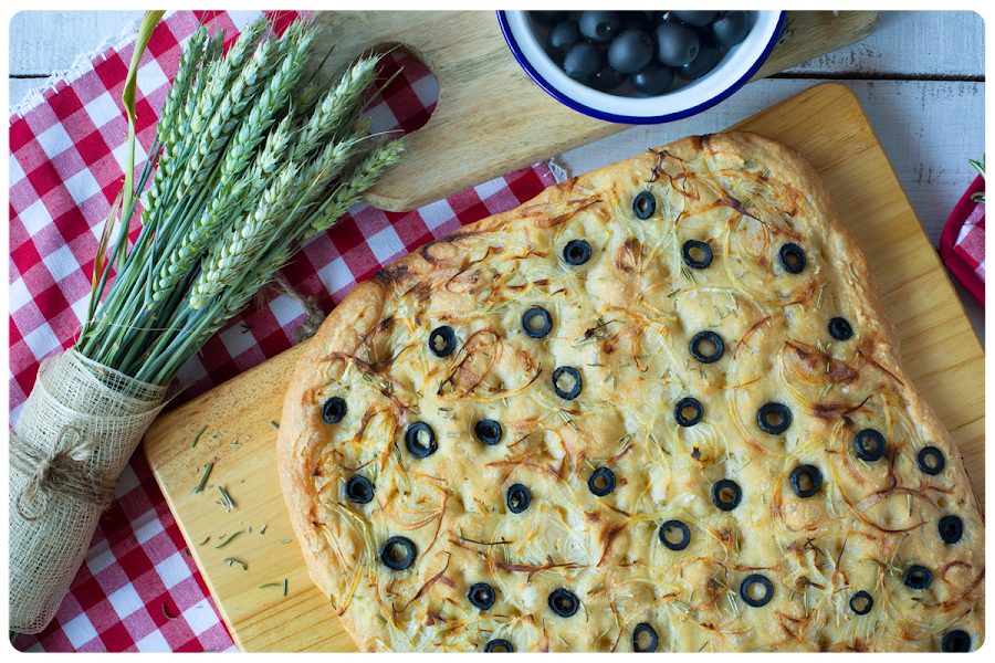 La focaccia es un pan tradicional italiano. La base es la harina, el agua, el aceite y la sal. Luego se le puede añadir lo que se quiera, como por ejemplo el romero y, en este caso, aceitunas negras sin hueso. Con anterioridad habíamos hecho un par de focaccias: la clásica y una con tomates cherry.