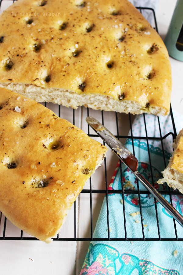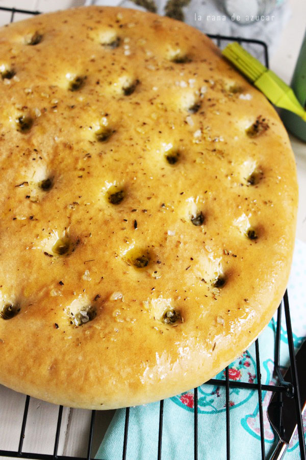 La receta es la focaccia de romero de Lorraine Pascale, sólo que yo cambié el romero por las hierbas provenzales o podéis variarla con el sabor que mas os guste.