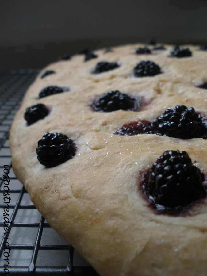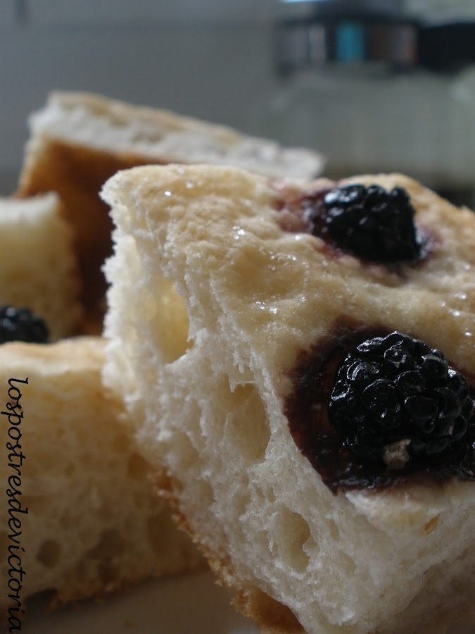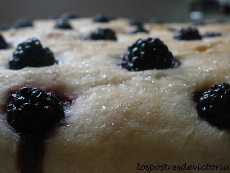 Untamos un molde de aceite, de unos 38x23 cm. y aplanamos la masa con las manos, echamos las moras por encima y volvemos a dejar levar unos 45 min. hasta que crezca.