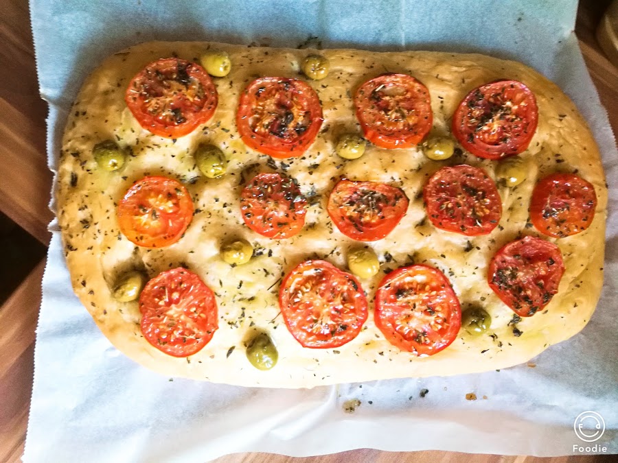 - Repartimos los tomates en rodajas y las aceitunas, y volvemos a pintar con el aceite/orégano.