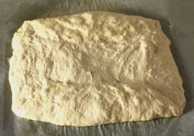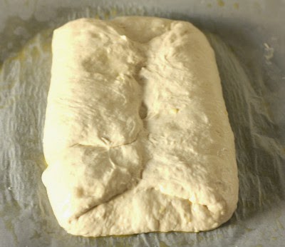4 - Cuando la masa haya doblado o triplicado su volumen. pasamos la masa a una bandeja con abundante aceite (importante), yo la puse en un molde grande rectangular con papel de horno bien aceitado.