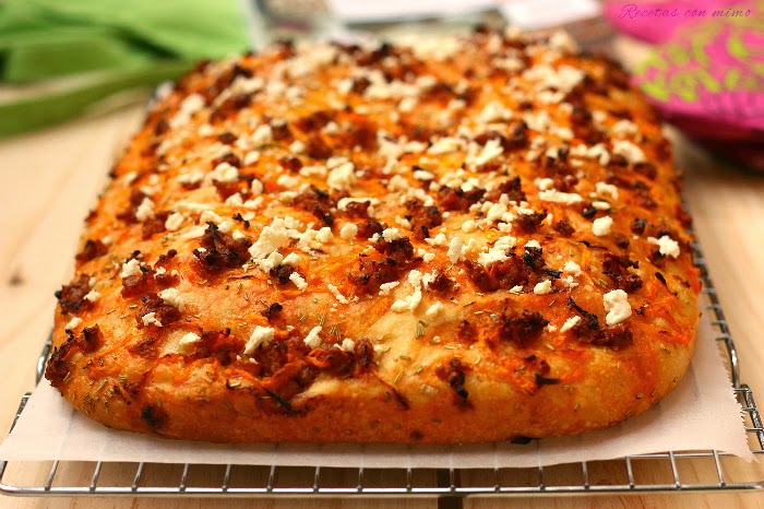 Pues en cuanto los reyes magos me regalaron el libro de Ibán Yarza "Pan casero" y ví esta Focaccia de Patata no tuve la menor duda... tenía que hacerla. Le iba como anillo al dedo al reto porque mi hijo adora el pan y adora la chistorra (o como él dice la salchicha-chorizo). Añadí el queso feta y el Romero como toque extra y me puse manos a la obra.