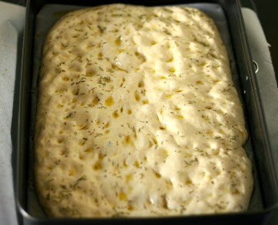 5 - Horneamos 10 minutos a 250º con mucha humedad (echando un vaso de agua en la bandeja del horno qje .a habremos puesto en la parte más baja del horno) y otros 20-25 min a 200º. Si vemos que empiez a tostarse demasiado pronto pondremos papel de aluminio por encima. Terminamos los 10-15 ultimos minutos poniendo la focaccia en el nivel más bajo del horno para que se dore la base y conseguir aun más el punto crujiente.