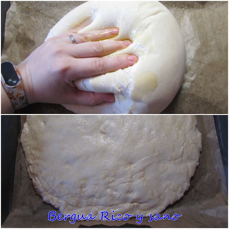 5. En ese tiempo, la masa habrá crecido. Nos volvemos a untar las manos con aceite para que no se nos seque la masa y la aplastamos hasta que tenga 1,5-2 cm de grosor y asegurándonos de impregnar la masa cruda con el aceite. La dejamos levar 20 minutos más en el horno a 30º.