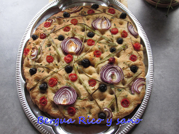 Cuando vi en Pinterest que la gente se había lanzado a decorar sus focaccias (hogazas), no me pude resistir y enseguida me lancé a hacer una. Así sale una de tamaño hermoso, pero también puedes dividir la masa y hacer 2-4 más pequeñas.