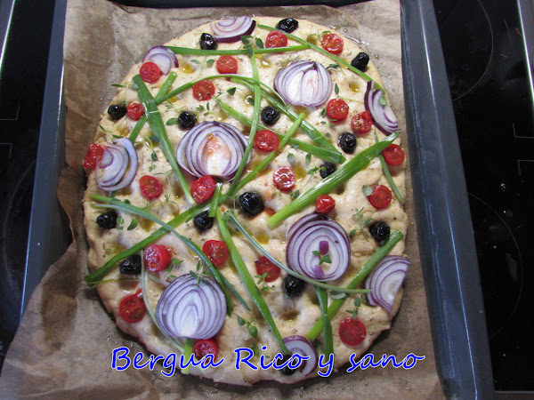 10. Finalmente horneamos durante unos 20 minutos o hasta que la focaccia esté doradita por encima; yo pongo calor arriba y abajo y al final ya cambio a grill o ventilador para darle el color que le falte.
